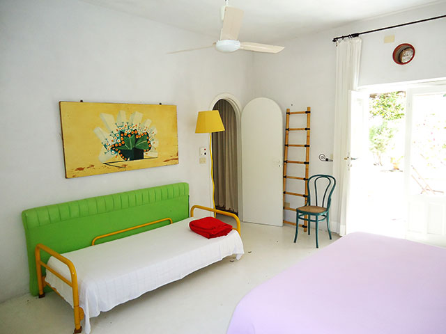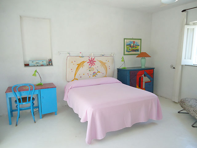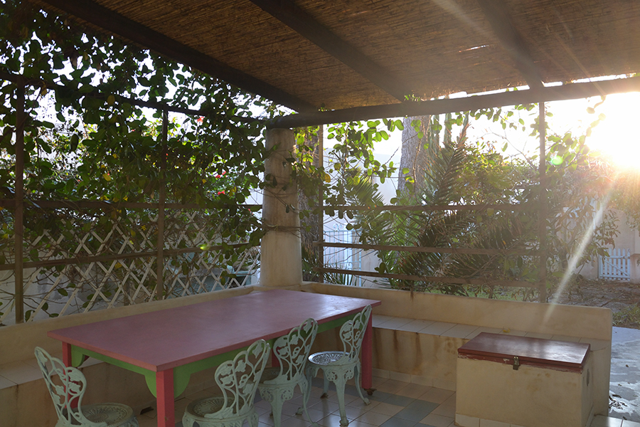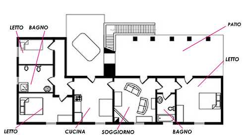 La casa ha un grande patio sul quale aprono tutte le stanze e che, a sua volta, affaccia sul giardino, è attrezzato come zona giorno e pranzo all’aria aperta.• Camera matrimoniale con bagno e doccia.